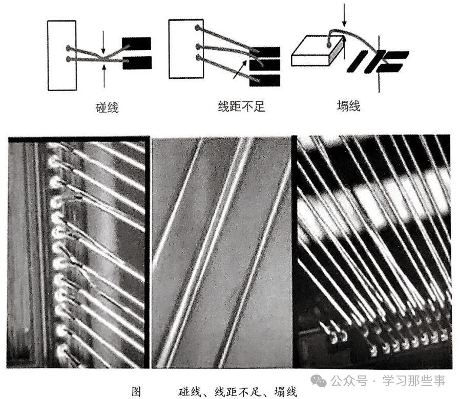 碰线、线距不足、塌线:检查金属引线之间或金属引线与芯片之间是否存在短路,线弧与线弧、线弧与芯片边缘、线弧与其他引脚之间的间距需符合规定,避免短路和塌线现象。
